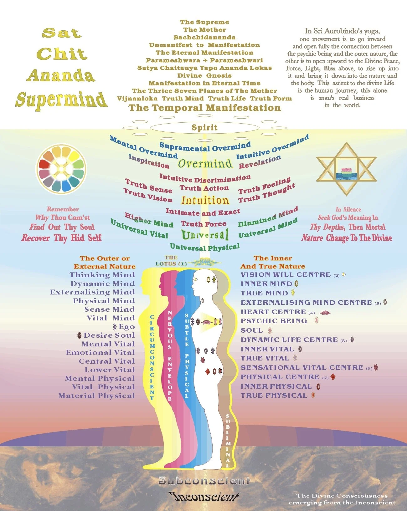 “The psychic [evolving soul of the individual] will be the vehicle of true and pure love, the mind that of infallible knowledge, the vital will manifest an invincible power and strength and the body will be the expression of a perfect beauty and a perfect harmony.”